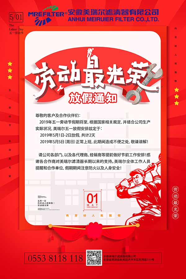 尊敬的客戶及合作伙伴們:2019年五一勞動節(jié)假期將至,根據(jù)國家相關(guān)規(guī)定,并結(jié)合公司生產(chǎn)實際狀況,美瑞爾五一放假安排茲定于:2019年5月1日-2日放假,共計2天,2019年5月5日(周日)正常上班,...