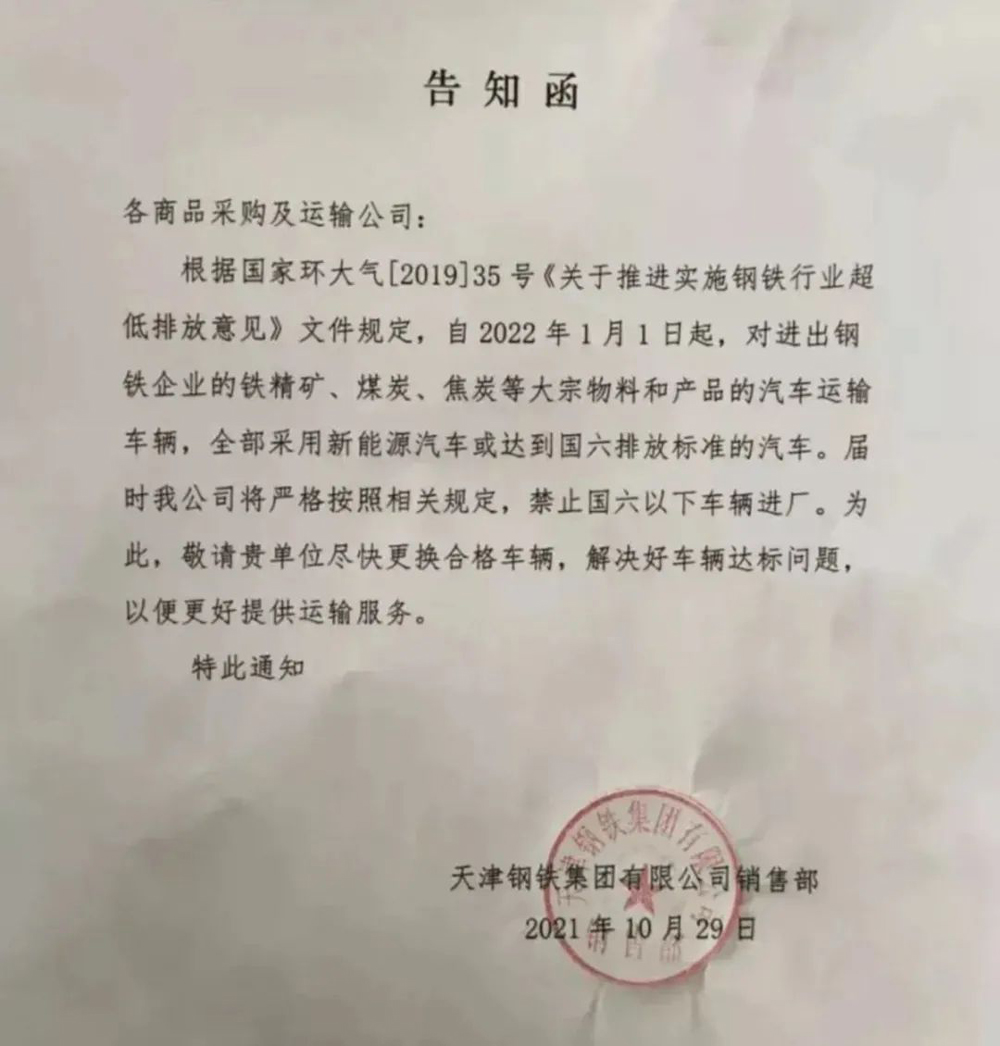 根據(jù)此前網(wǎng)上曝光的照片,天津市鋼鐵集團(tuán)已經(jīng)發(fā)布通告,自2022年1月1日起,對(duì)進(jìn)出鋼鐵企業(yè)的大宗物料和產(chǎn)品的汽車運(yùn)輸車輛,全部采用新能源汽車或者達(dá)到國(guó)六排放標(biāo)準(zhǔn)的汽車,并且屆時(shí)將嚴(yán)格按照相關(guān)規(guī)定,禁止國(guó)六以下車輛進(jìn)廠。