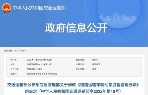 2022年2月23日,交通運(yùn)輸部、公安部、應(yīng)急管理部三部門(mén)發(fā)布《道路運(yùn)輸車(chē)輛動(dòng)態(tài)監(jiān)督管理辦法》的修改決定。