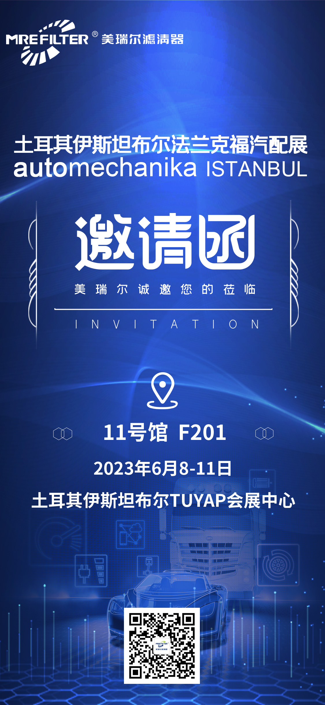 2023 年土耳其(伊斯坦布爾)國際汽車零配件及售后服務展覽會將于2023年6月8-11日在伊斯坦布爾 TUYAP 展覽會議中心舉行,安徽美瑞爾濾清器有限公司在11號館F201展位與您相會!