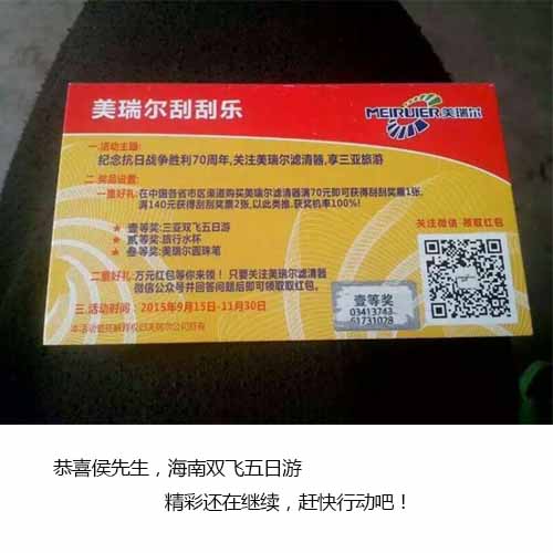 2.在中國各省市區(qū)渠道購買美瑞爾濾清器滿70元即可獲得刮刮獎票1張,滿140元獲得刮刮獎票2張,以此類推。獲獎機率100%!